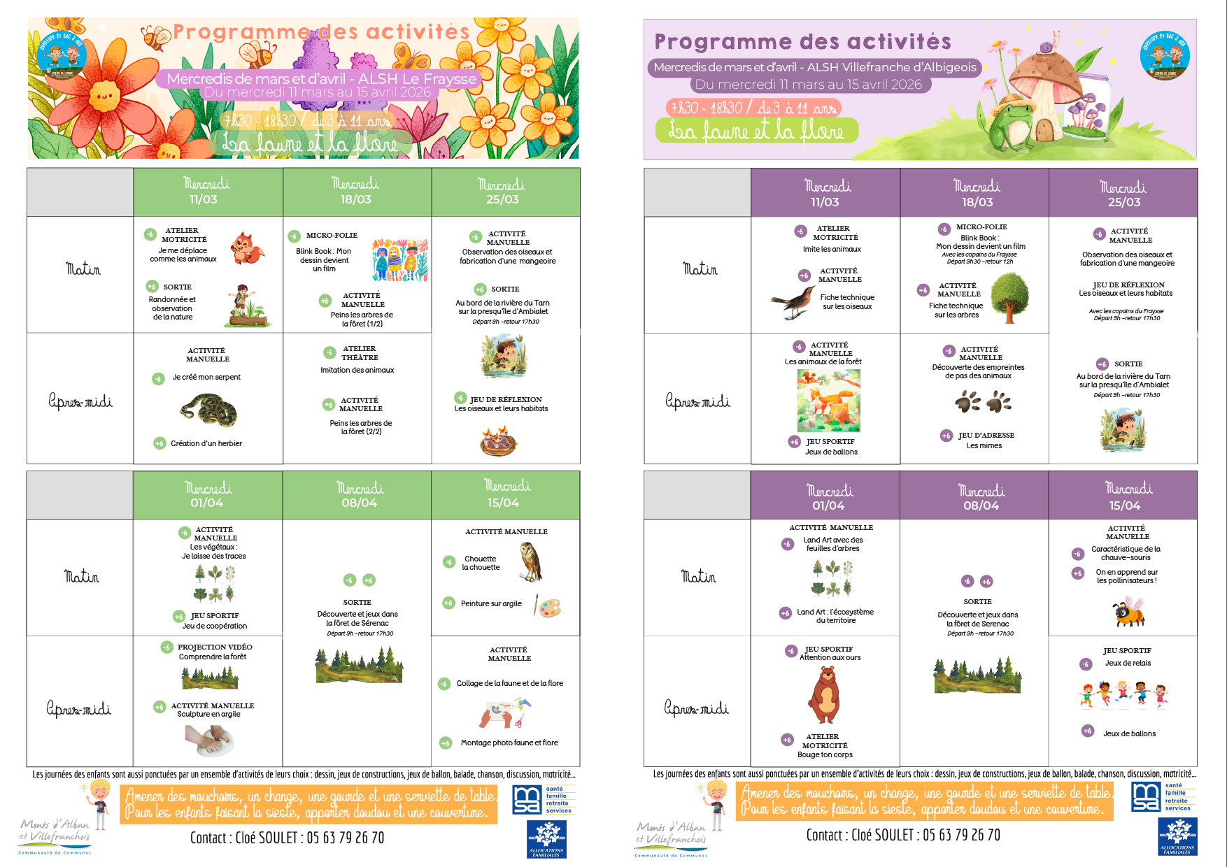 Les Accueils de loisirs sont situés sur les communes de Villefranche d'Albigeois et du Fraysse. Tous les enfants de 3 à 11 ans sont les bienvenus pour s'amuser autour de loisirs éducatifs de 7h30 à 18h30.