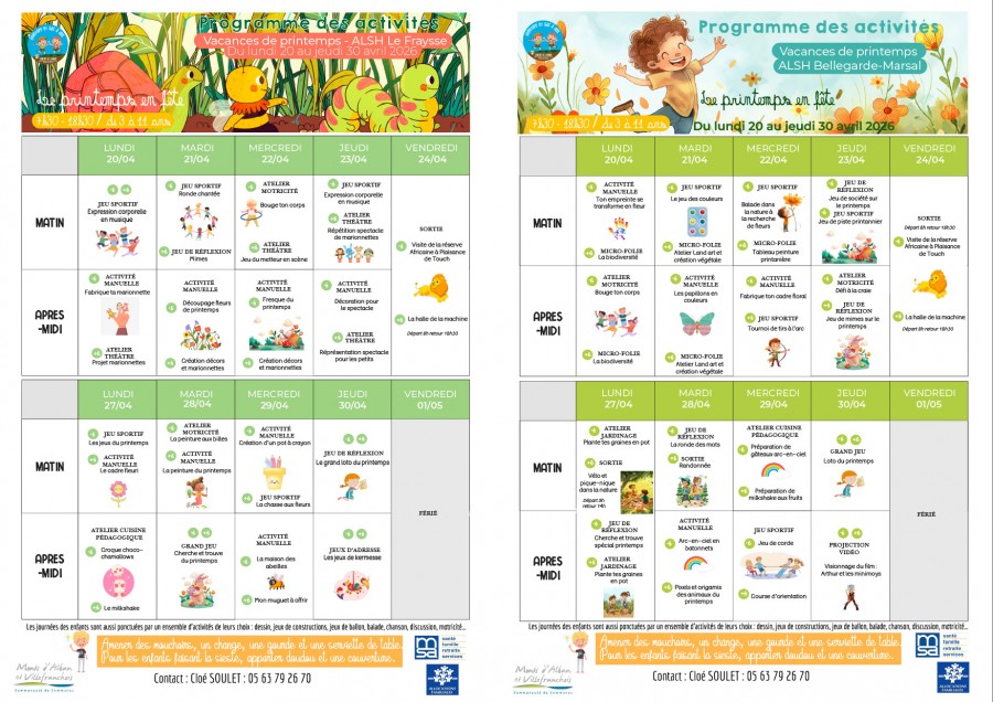 Les Accueils de loisirs sont situés sur les communes de Bellegarde-marsal et du Fraysse. Tous les enfants de 3 à 11 ans sont les bienvenus pour s'amuser autour de loisirs éducatifs de 7h30 à 18h30.