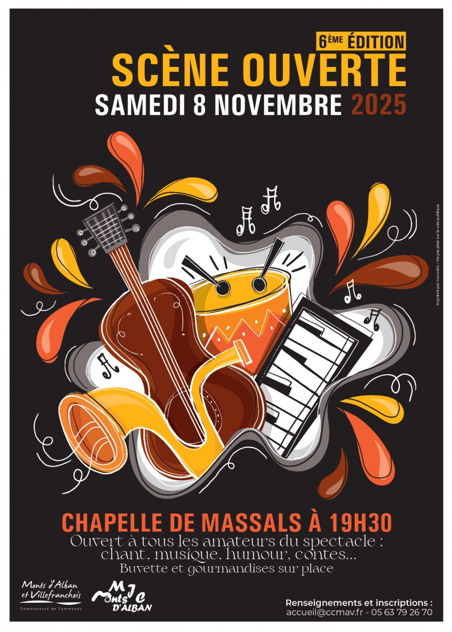La MJC des Monts d’Alban et la Communauté de Communes des Monts d’Alban et du Villefranchois organisent la 6ème édition de la scène ouverte le samedi 8 novembre à partir de 19h30 à la Chapelle de Massals.