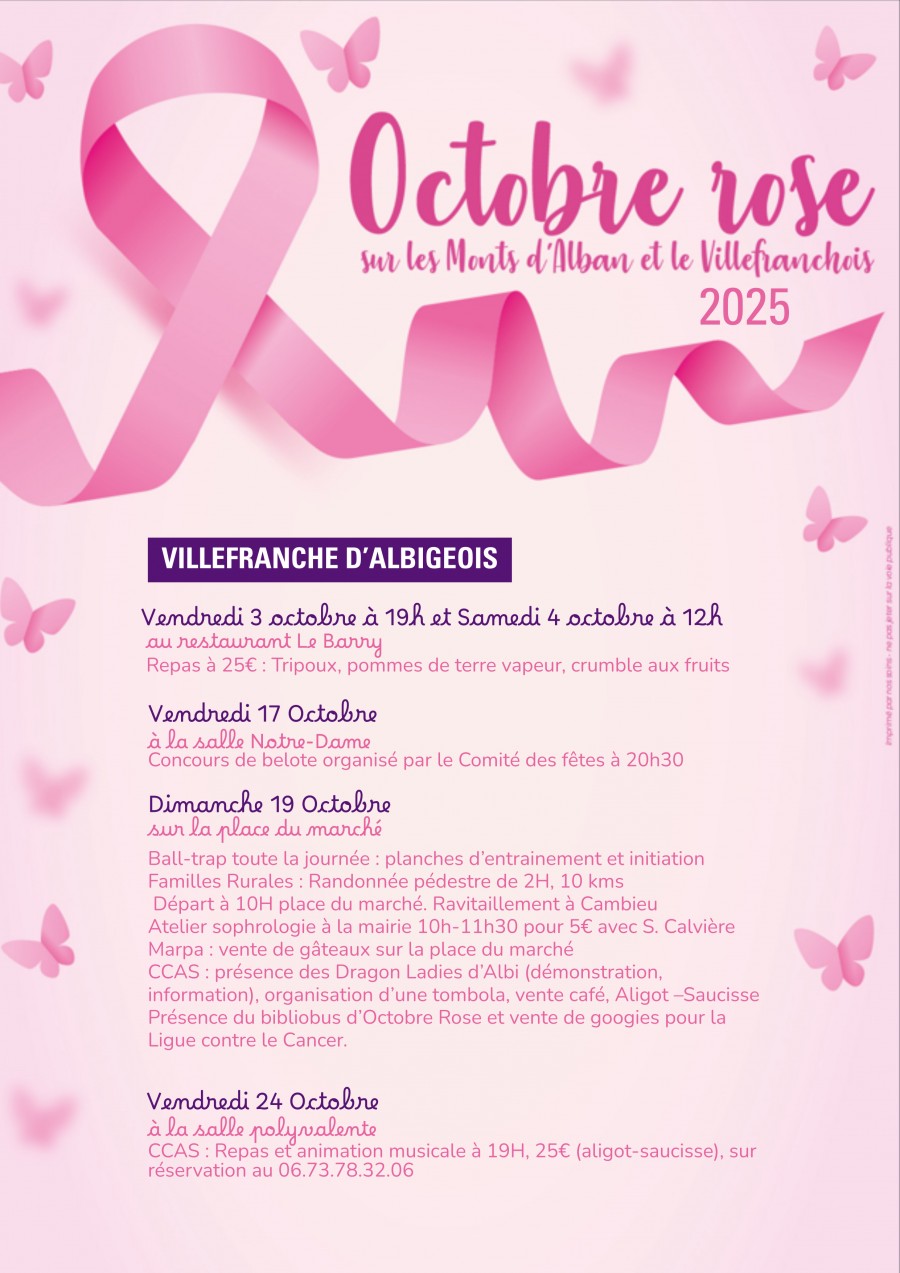 Tout l'agenda Tous les événements passés Abonnez-vous Octobre rose, à Villefranche d'Albigeois Du 03/10/2025 au 24/10/2025 Animations du 3 au 24 octobre 2025. Retrouvez le programme ici.